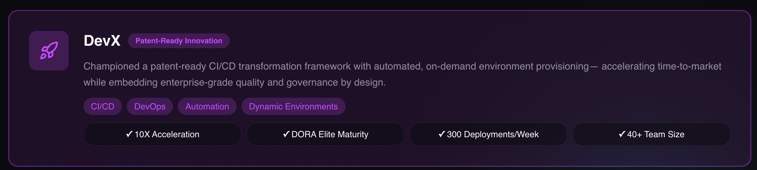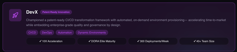 Delivery Innovation: Pioneered patent worthy dynamic SaaS environment provisioning for every code change, accelerating lead time to production and redefining developer experience.