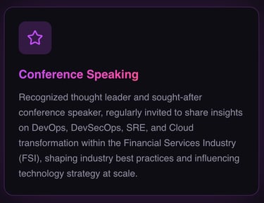On the global stage, I am a renowned conference speaker in DevOps, DevSecOps, and Cloud transformation, celebrated for turning complex technology shifts into inspiring, actionable journeys of change.