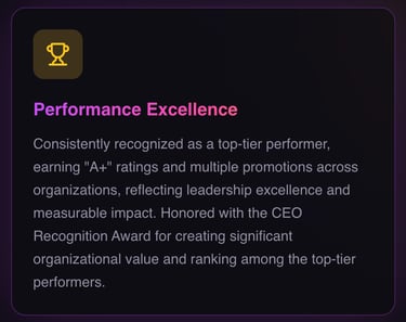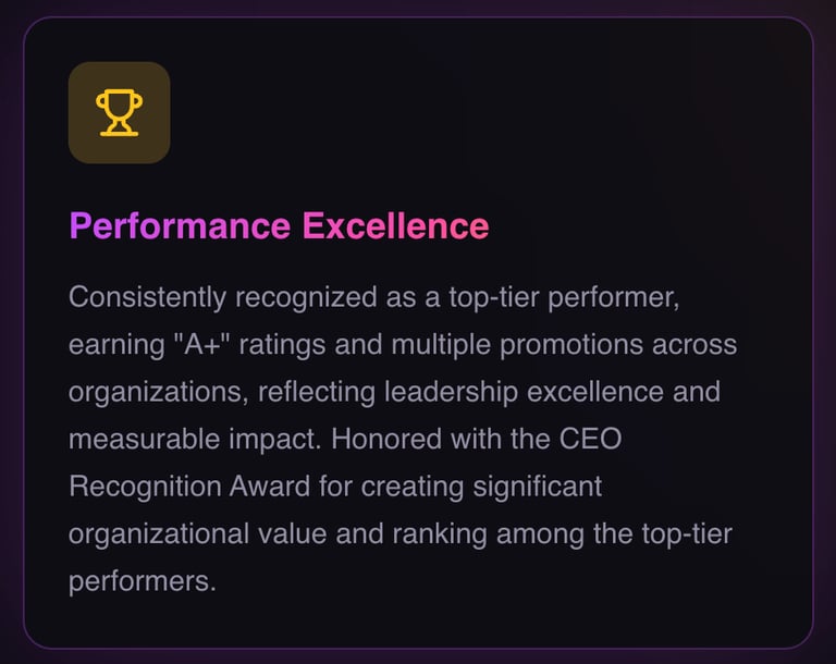 Elite Leadership: Consistently a top performer, recognized for breaking silos, aligning cross-functional teams, and delivering measurable business impact.