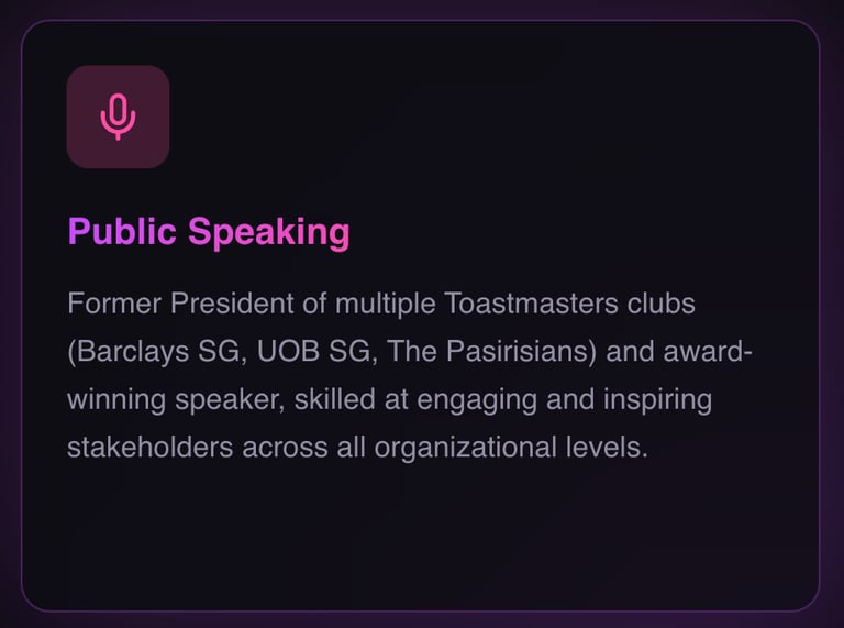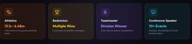 Beyond the court, I am an award-winning Toastmaster and public speaker, with victories at club, area, and division levels—a testament to my relentless pursuit of growth and leadership excellence.