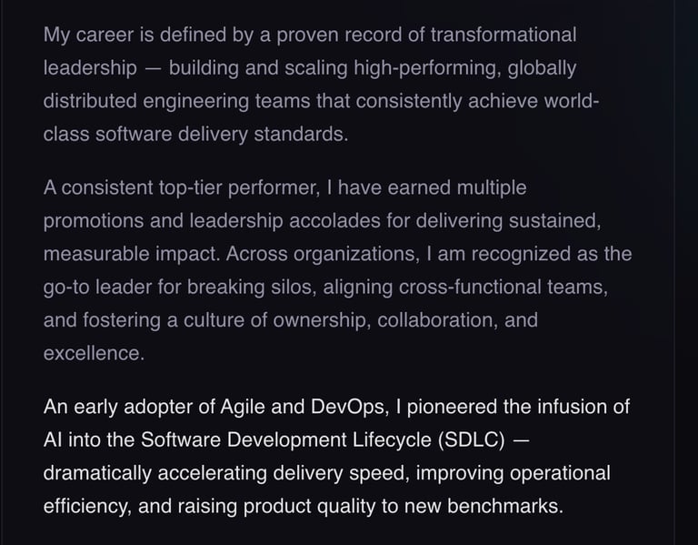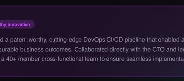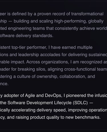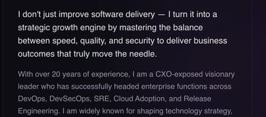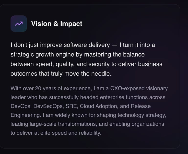 I don't just improve software delivery — I turn software delivery into a strategic growth engine by mastering the balance between speed, quality, and security to deliver business outcomes that truly move the needle.