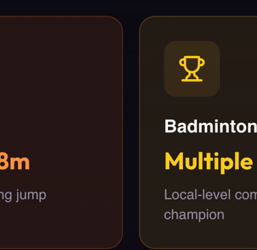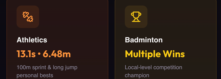 I am a passionate athlete with personal bests of 13.1 seconds in the 100-metre sprint and 6.48 metres in the long jump. Sports play a central role in shaping my discipline, focus, and goal-oriented mindset.